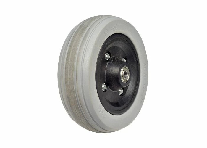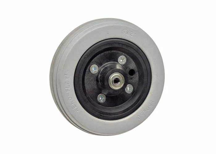 These wheels show a little use, just enough to leave some stains but not enough to create any serious wear. This little Aero-Flex brand wheel assembly can serve as a front or rear caster, or as an anti-tipper. The size is what makes this assembly truly universal, with a compatibility almost too extensive to begin listing. Among the veritable plethora of power chair models are numerous Jazzy models including the 614, 614HD, Quantum Q614, and many, many more. This is a very common size and style of power chair caster wheel, and has for the most part replaced the larger older style 200×50 (8″ x 2″ roughly) polyurethane, foam-filled, or pneumatic caster wheels.