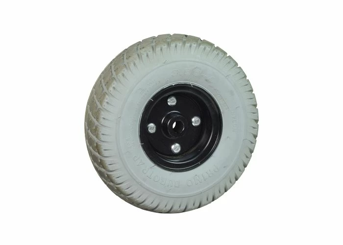 Please note that this Jazzy wheel assembly’s rim is of a split rim design (the bolts are on the back side of the rim), and the tire can be replaced without replacing the entire assembly.