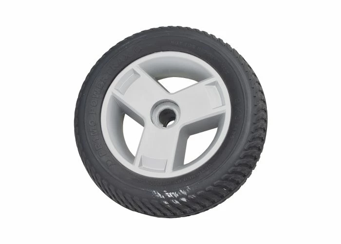 This complete drive wheel assembly includes a flat-free non-marking black tire and stylish silver tri-spoke rim.
