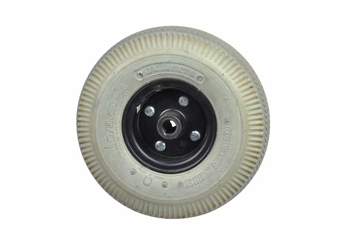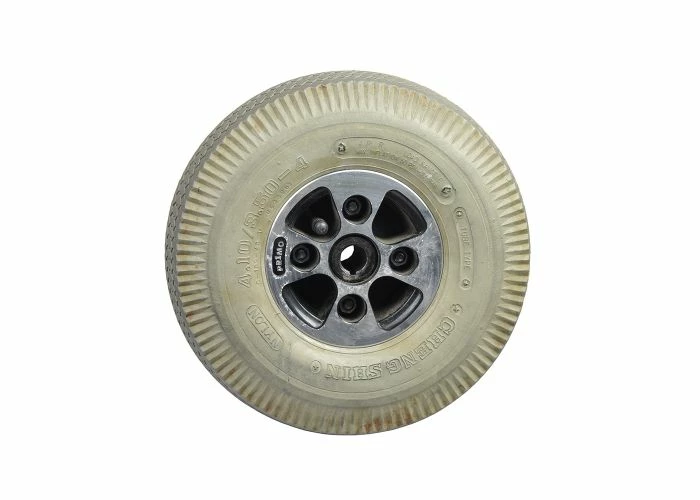 Our used drive wheel assembly for the Hoveround® Teknique FWD® electric power chair features a Cheng Shin 410/350-4 pneumatic tire and a Pr1mo 2-part split rim